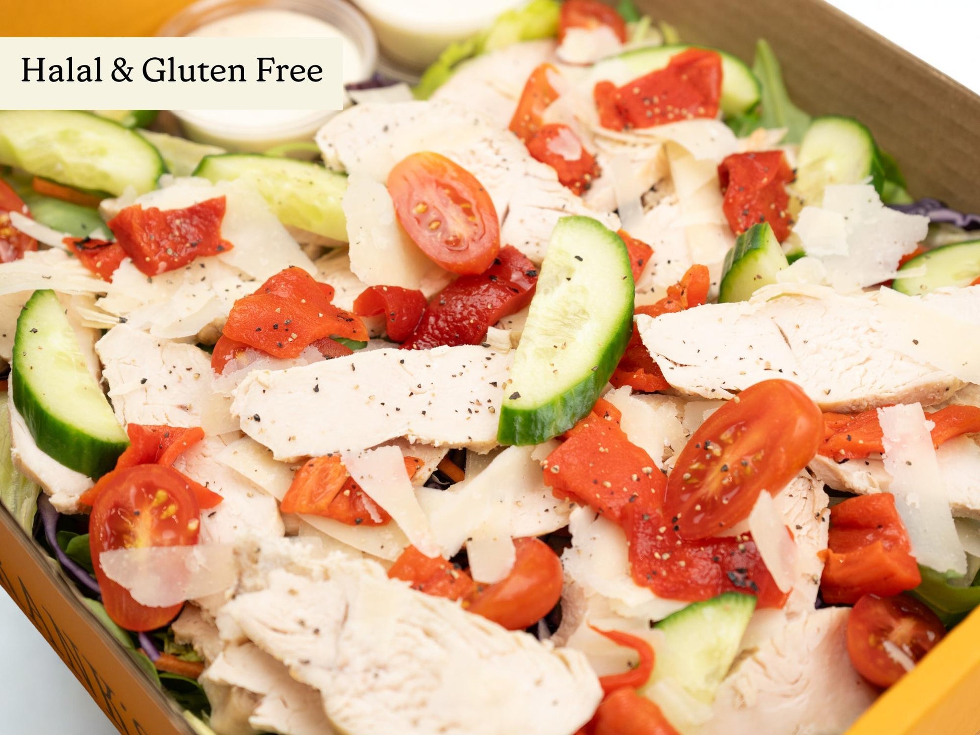 Grilled chicken breast with roasted peppers, shaved gran Moravia cheese, cherry tomato & cucumber.
