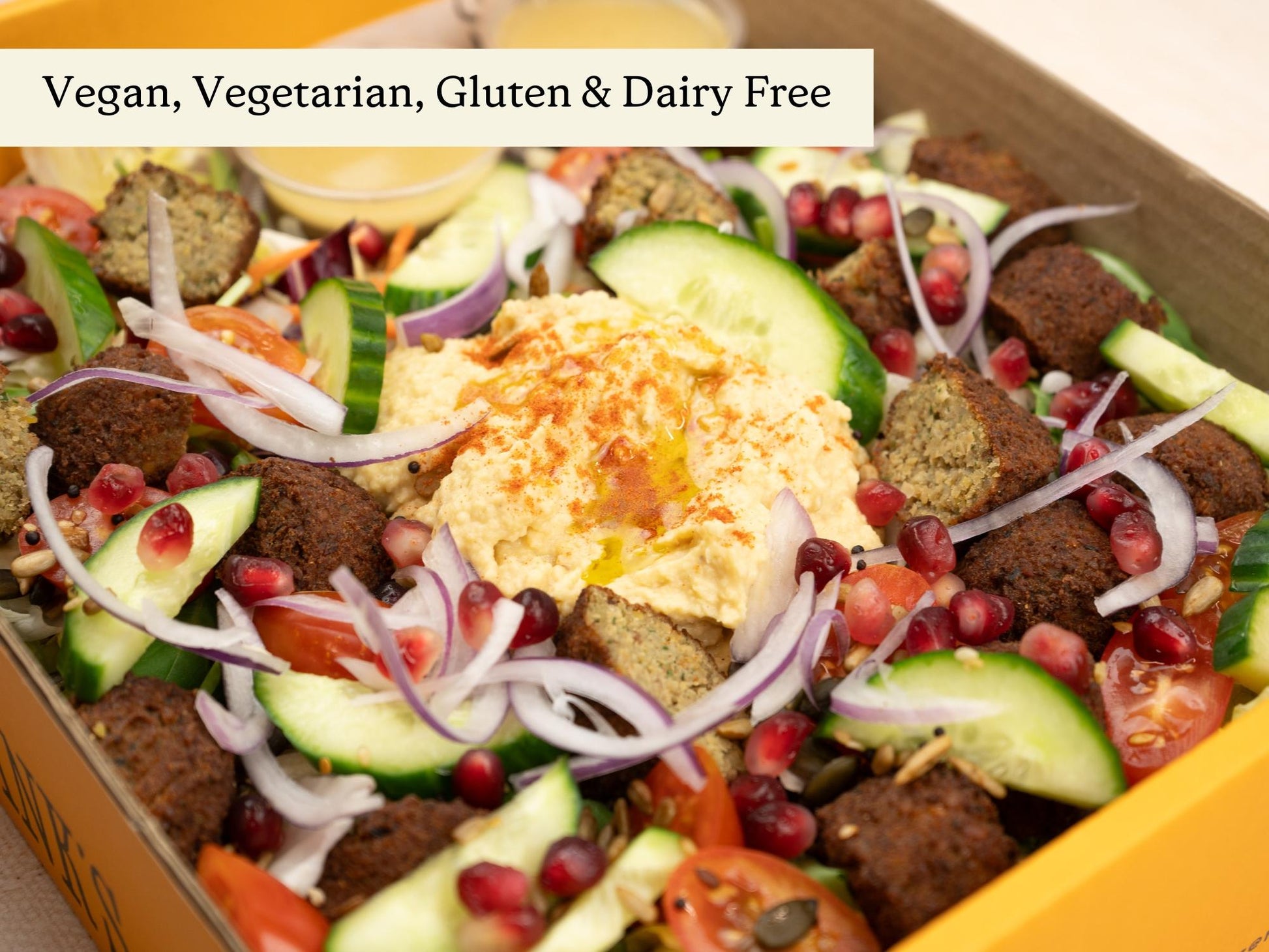 Falafel with houmous, red onion, pomegranate, mixed seeds, cherry tomato & cucumber.