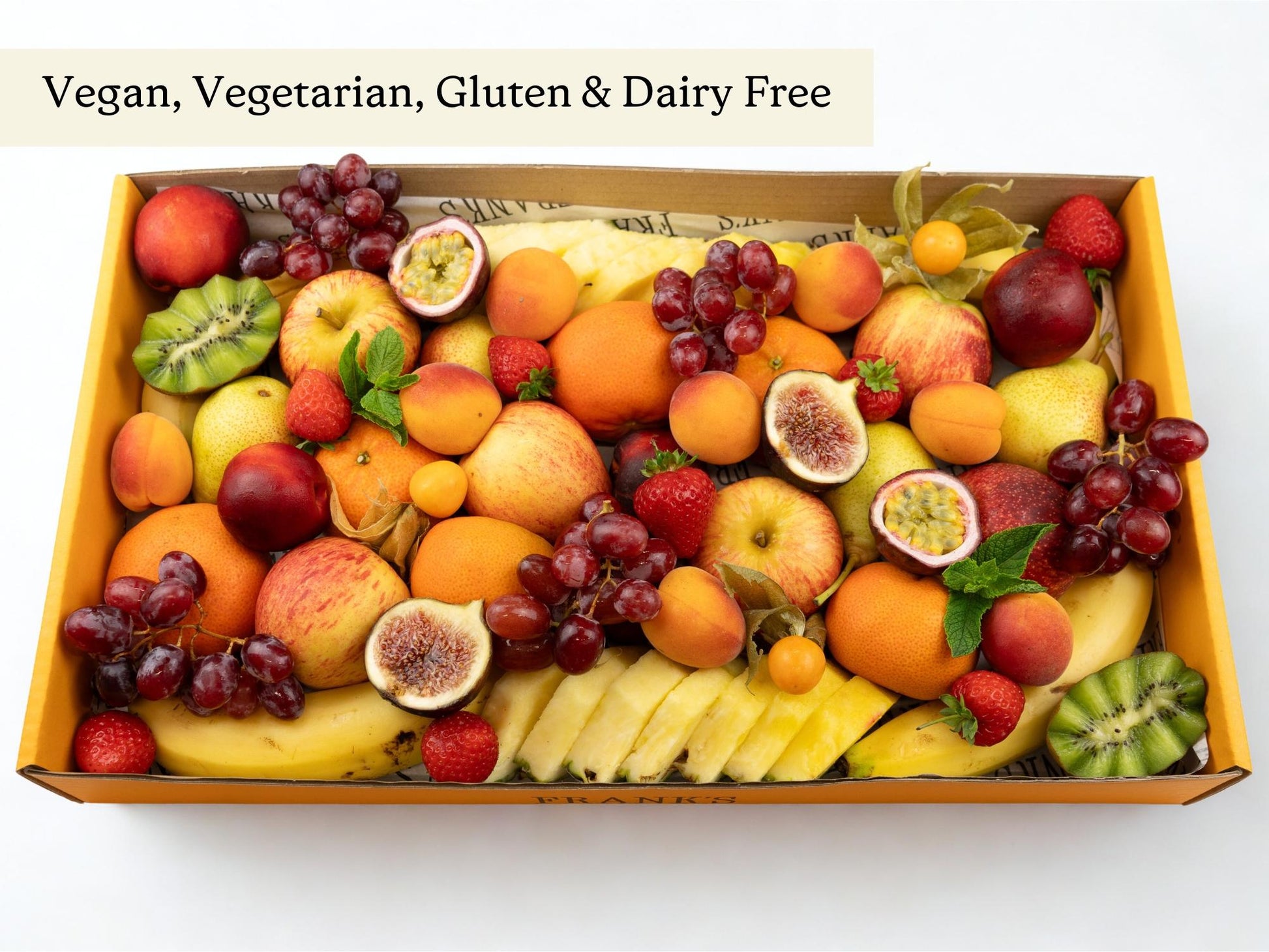 Bananas, apples, satsumas, pears, plums, grapes, strawberries, kiwi, passionfruit, sliced melon & pineapple.