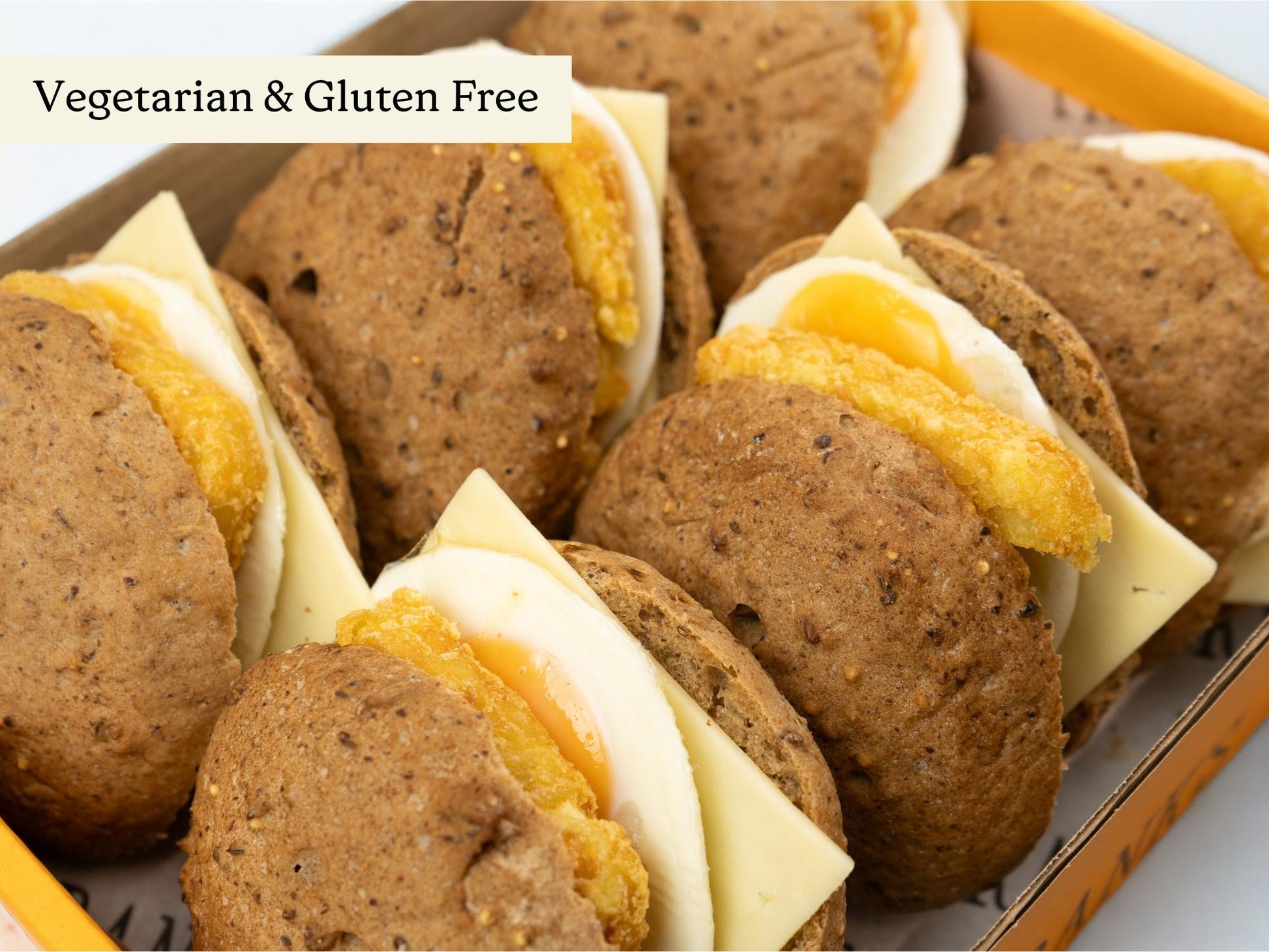 A selection of freshly baked hot gluten free breakfast baps filled with Egg, Hashbrown & Cheddar Cheese.