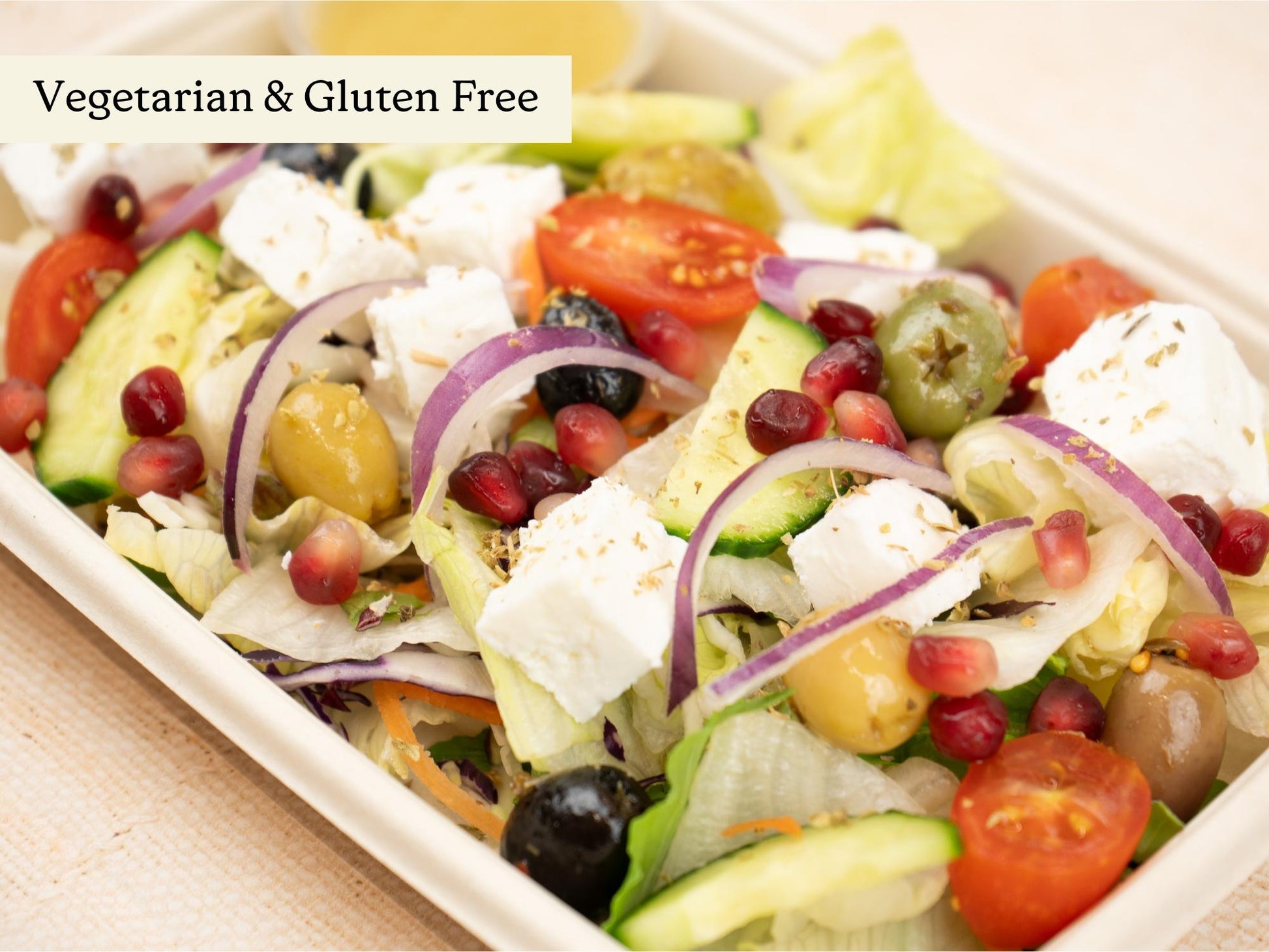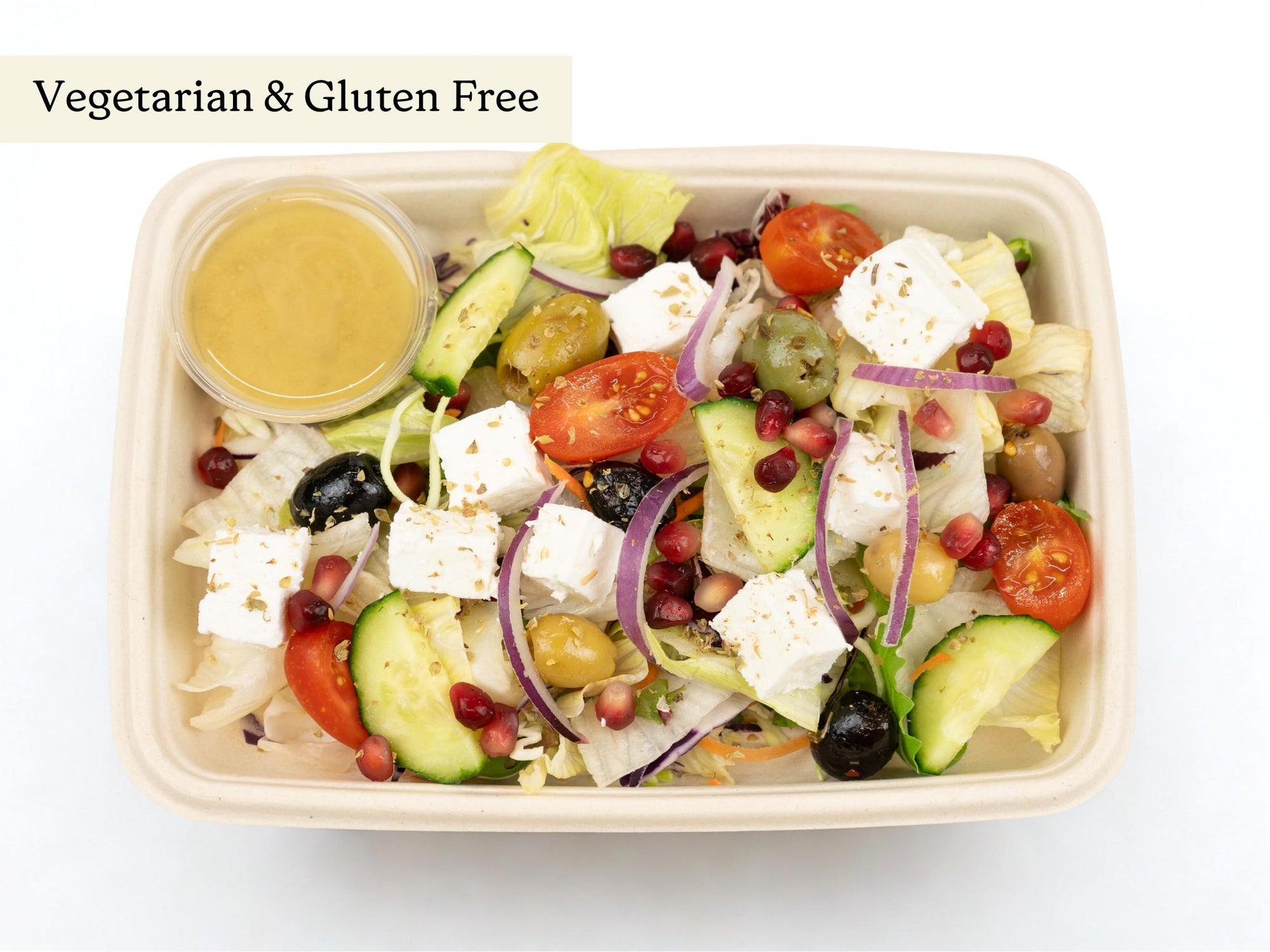 Creamy Feta cheese chunks with cherry tomato, cucumber, red onion, marinated olives, pomegranate seeds & oregano.