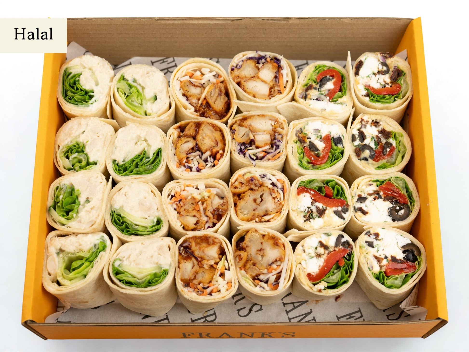 Each platter box is clearly labelled on the base with dietary and allergen information, so even when the lid is removed, the key details stay visible for safe and easy sharing.