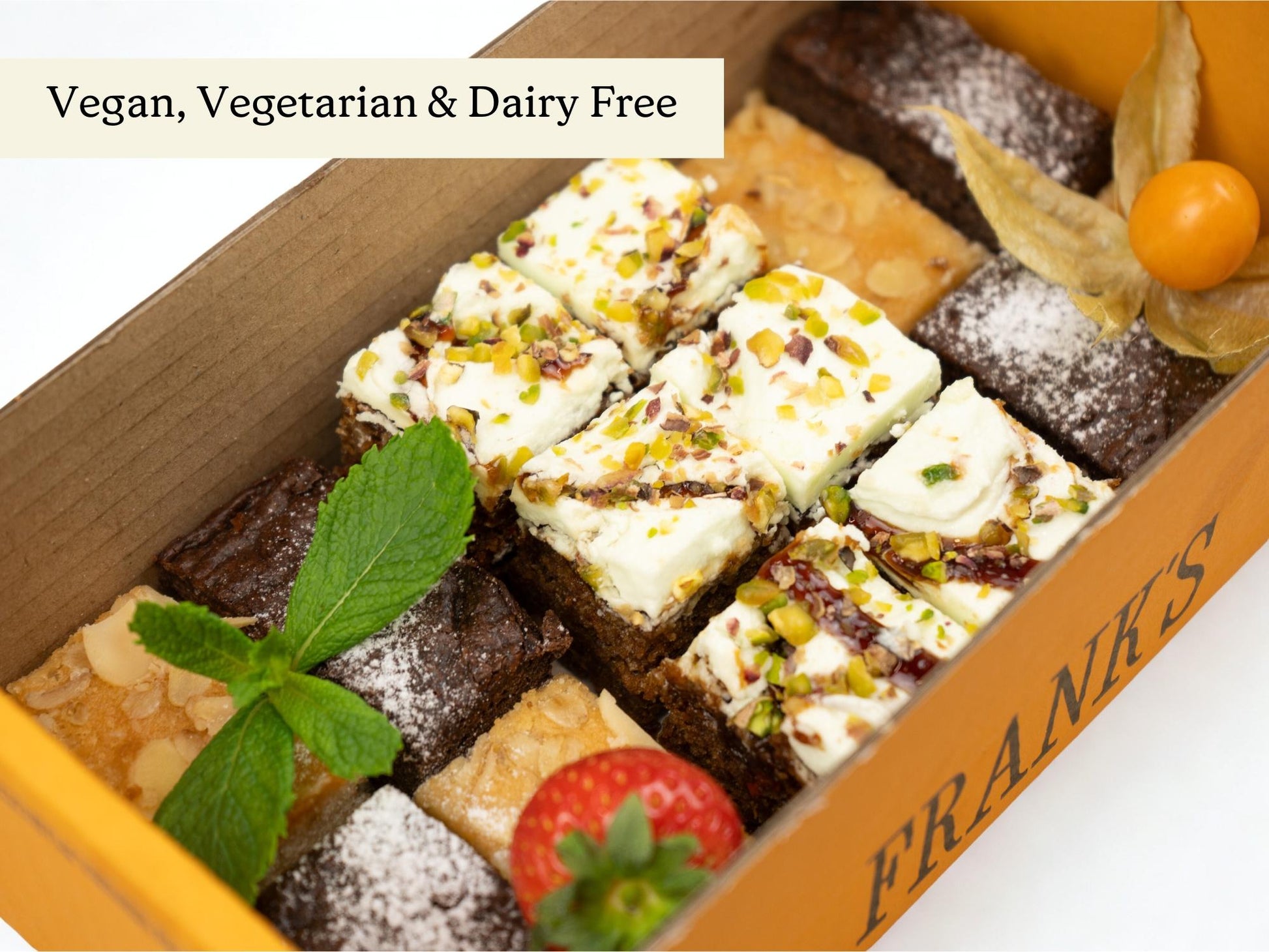 A selection of vegan bite sized cakes including: